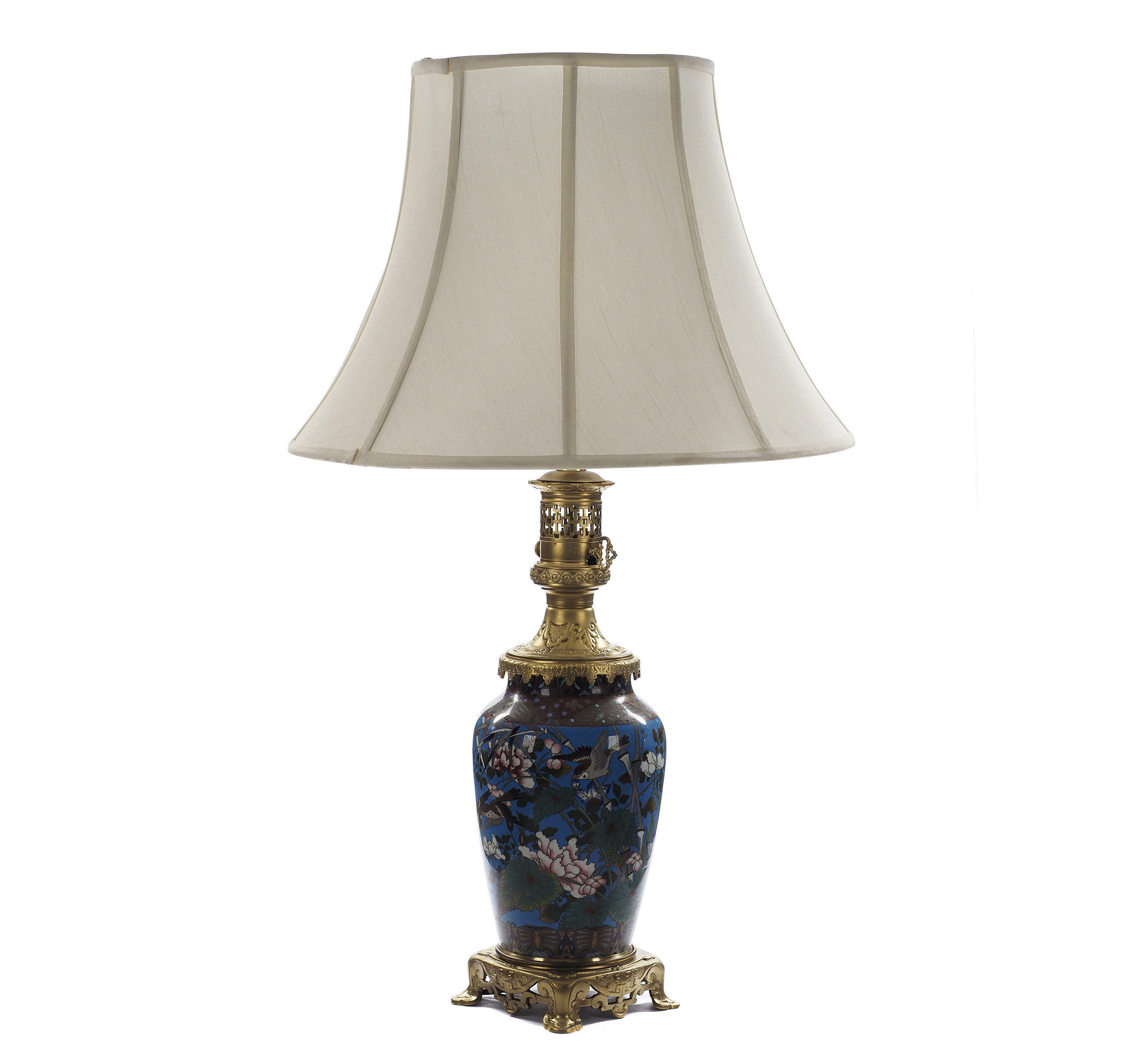 The ancient art of 'Cloisonné' enamelling using coloured molten glass was used in China some two millennia BC. The word comes from the French for 'cell', as a metal surface was dressed with patterns in brass, gold or silver wire, and the 'cells' created were then enamelled, and polished to a fine and even surface. In the present case of our lamps, initially Chinese vases, foliates and birds are to be seen.
