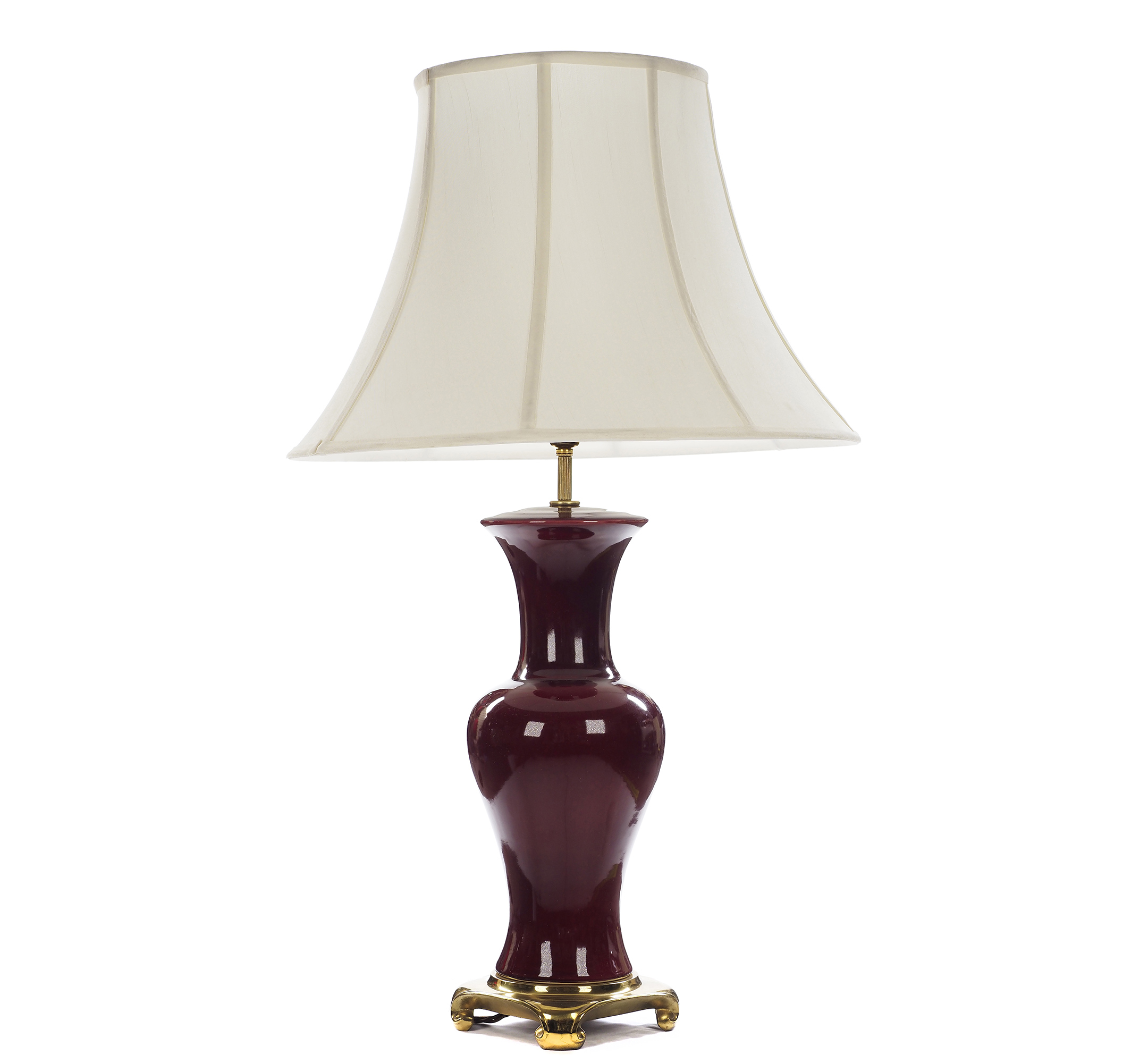 A pair of rare Continental baluster antique vase lamps having a Sang de Boeuf (Bull's Blood) glaze, and mounted on bronze base.